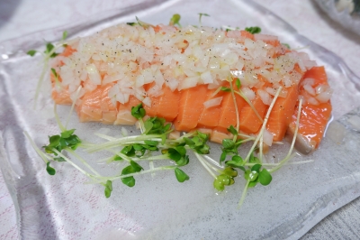 サーモンのカルパッチョ サラダ 豆腐、アボカド、トマト、ワカメ、海苔 豚肉の野菜巻き 玉ねぎ巻き、椎茸巻き ドリア 中身はケチャップ味···