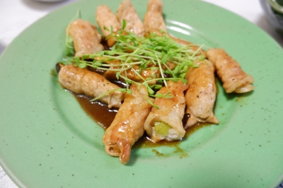 豚肉の野菜巻き 茄子、玉ねぎ、椎茸 春雨サラダ 青梗菜と卵のガーリックソテー パスタ ボロネーズソースに生協のハンバーグを刻んで加えま···