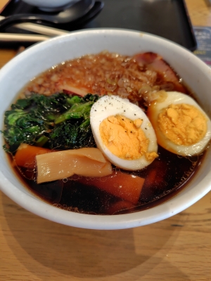 醤油ラーメン 卵の上のネギの下には叉焼が2枚 ほうれん草にメンマ 色が濃いけれど美味しいスープで塩気は少なかった。 これ美味しかったです。 ···